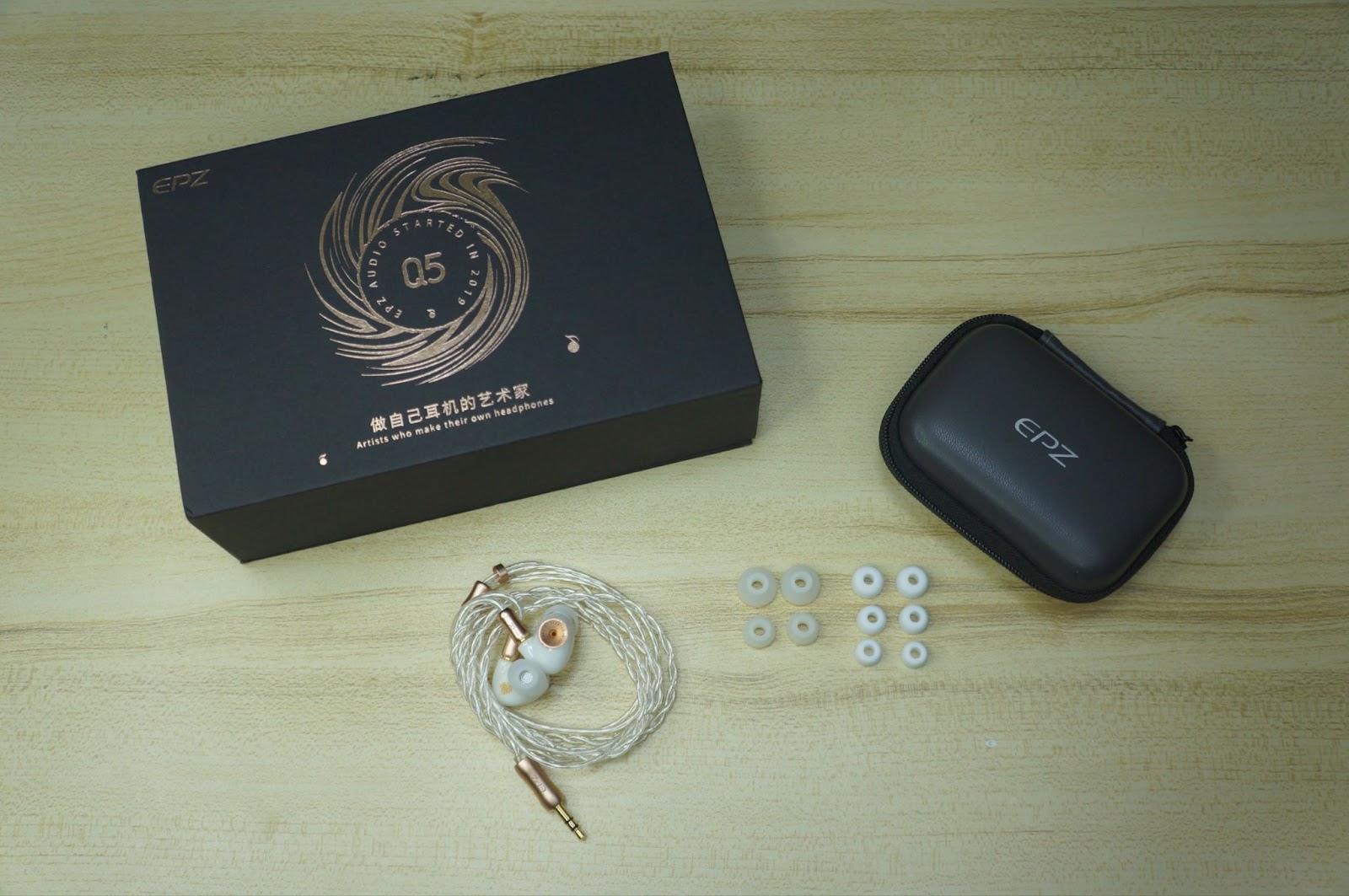 Starting with the unboxing, you get a rather large box with not a lot of accessories. You get the IEMs themselves, a carrying pouch, and some eartips. The eartips that come with the Q5 are quite special, however, as they have this Dunu S&S-looking type shape that is short but quite linear. I like how they fit with the Q5 but the stock 07 style tips aren’t bad either.