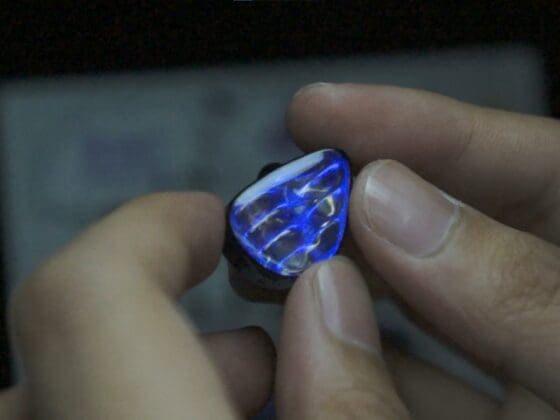 These can be purchased in tow different color options. “Transparent Black Gold” and “Transparent White” I received the “Transparent White” for review. this is a shiny metal shell…not white nor transparent, could just be a translation difference. Regardless they do indeed feel hefty in the hand and of good quality, the faceplates are metal as well but have a white, blue, red and yellow stripe on them. It looks kind of retro and unique for an IEM. I like it. The shell also has 3 tuning switches but from my testing there are only really two tuning options. One thing to note is that the shell being as shiny as it is gets all sorts of fingerprints and oils from your ears on it.